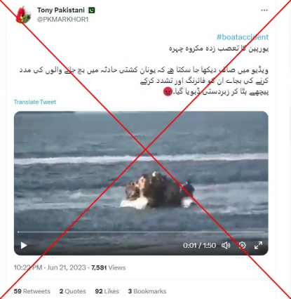“Το αποκρουστικό πρόσωπο της ευρωπαϊκής προκατάληψης. Φαίνεται ξεκάθαρα στο βίντεο ότι αντί να βοηθήσει τους επιζώντες του ναυτικού δυστυχήματος, η Ελλάδα τους πυροβόλησε και τους βασάνισε, τους έδιωξε και τους έπνιξε με τη βία.” διαβάζει Ουρντού λεζάντα για ένα βίντεο συνδρομητής στο Twitter εδώ στις 21 Ιουνίου 2023.
