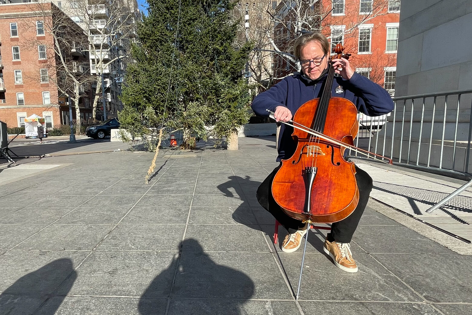 Ένα ηλιόλουστο και ήπιο χειμωνιάτικο απόγευμα της περασμένης εβδομάδας, κάτω από την καμάρα, ο κορυφαίος τσελίστας προσελκύει τεράστιο αριθμό ακροατών. Είναι μια τυπική μουσική στιγμή στο Washington Square Park. παίζει Bach Gee Major Εισαγωγή.