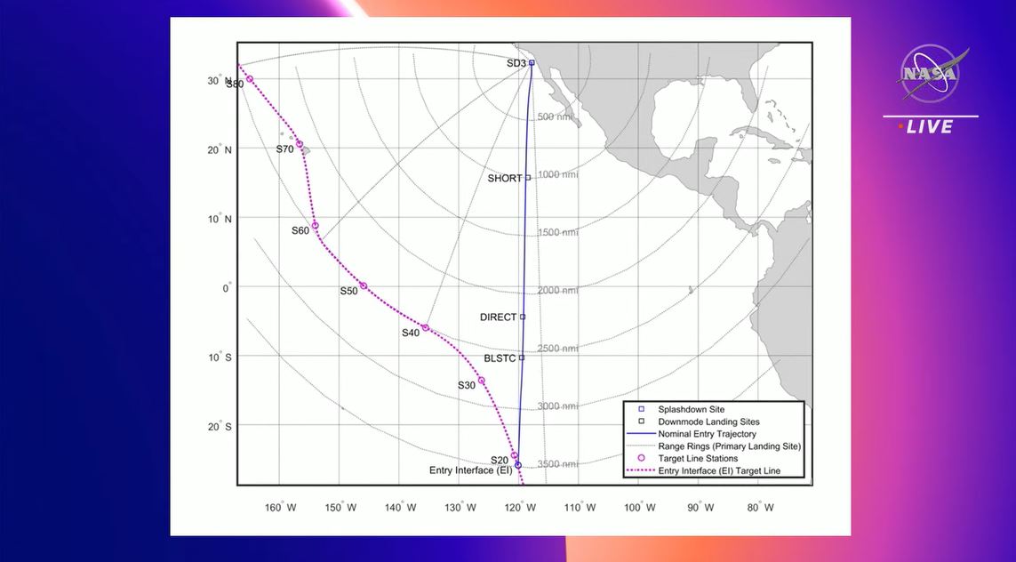Ένας χάρτης από τη NASA δείχνει την ιδανική τοποθεσία κατάρρευσης του Ωρίωνα στα ανοικτά των ακτών του Σαν Ντιέγκο καθώς και αρκετούς εφεδρικούς στόχους. Μια βαθύ μωβ γραμμή δείχνει την τροχιά στόχου του Ωρίωνα.