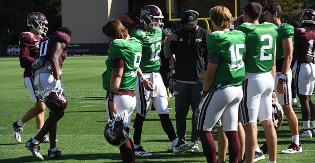 Πέντε από τους έξι στρατηγούς του Μισισιπή State συζητούν με τον βοηθό προπονητή ποδοσφαίρου Drew Hollinghead-First Chance Loverich (No.9, 5-11, 190), πρωτοετής με κόκκινη φανέλα Sawyer Robertson (No.12, 6-4, 215), πρωτοετής Red φανέλα Τζέικ Γουέρ (Νο. 15, 6-2, 205), πρωτοετής Γουίλ Ρότζερς (Νο. 2, 6-2, 210) και πρωτοετής με την κόκκινη φανέλα Ντάνιελ Τζόνα (Νο. 3, 6-4, 225). Αν και δεν μπορείτε να τον δείτε, ο προπονητής Mike Leech στέκεται στα αριστερά του Hollinghead και μιλά με τον Sawyer Robertson.