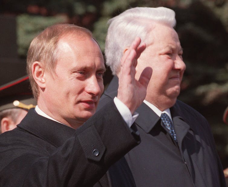Ο Βλαντιμίρ Πούτιν (αριστερά) με τον Μπόρις Γέλτσιν κατά τη διάρκεια μιας παρέλασης στην Κόκκινη Πλατεία το 2000.